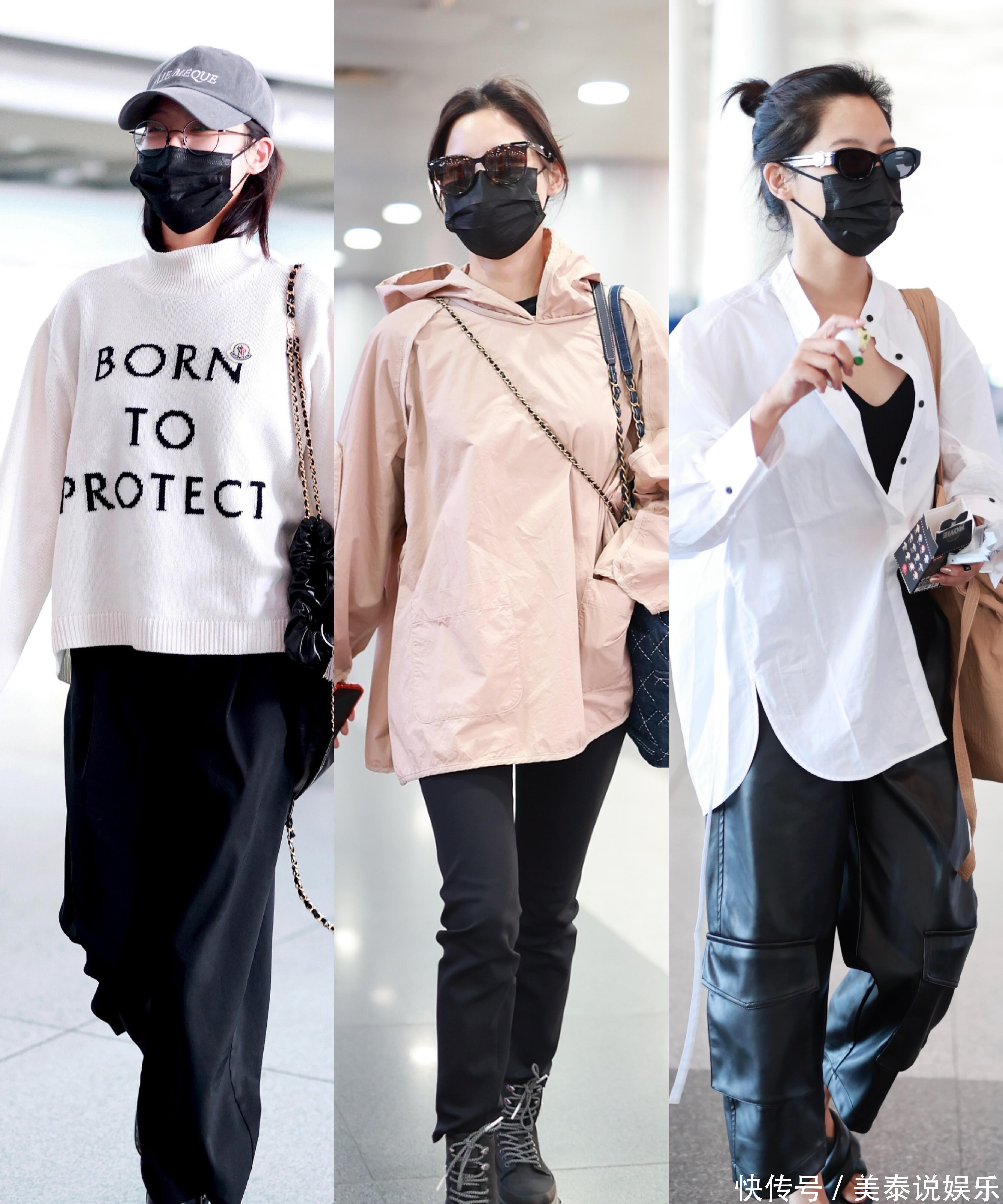 先看左边这套,深灰色紧身针织衫配墨绿阔腿牛仔裤,脚踩黑色拖鞋,再搭个黑色大托特包,头上还扣了顶黑色渔夫帽,帽檐上别着副墨镜,全程捂得严严实实但丝毫不显闷。紧身针织衫刚好贴出线条,不会松垮得没型;墨绿阔腿裤垂感能当镜子,裤脚盖住拖鞋鞋帮,显腿长还藏肉;大托特包往肩上一挎,装得下电脑、水杯,实用又有“松弛感”——这套穿去赶早班机,不用折腾发型妆容,戴个口罩就能走,舒服到想直接在飞机上睡觉。 中间那套更绝,浅灰色oversize短袖配米白色阔腿裤,踩双黑色拖鞋,挎个印满文字的黑色大包,手里还抱了束红色鲜花。短袖大到能当裙子穿,袖口松松垮垮堆在胳膊肘,透着“没刻意打扮”的随性;米白阔腿裤软乎乎的,走起来裙摆似的晃,连拖鞋都选了带点跟的款式,悄悄垫了身高。最妙的是那束红玫瑰,跟浅色调的穿搭撞出反差,让“随便穿穿”的造型多了点鲜活感——这哪是赶机场,明明是刚跟朋友喝完咖啡顺路去赶飞机。 右边这套把“混搭”玩明白了:深灰色短款风衣敞开穿,里面是白色内搭和同色系阔腿裤,脚踩双白棕拼色的穆勒鞋,头发盘成低发髻,还别了副墨镜当装饰,手里抱着蓝红配色的玩偶,甜酷感一下就出来了。短款风衣刚好盖过屁股,不压个子还能遮腰上的肉;白色阔腿裤跟内搭顺成一片,显干净还显高;穆勒鞋露着脚踝,中和了风衣的厚重,连玩偶都成了配饰——这套穿去机场,既有“明星私服”的气场,又不会像走秀似的夸张,普通人上班穿都合适。 蕾子姐这几套的精髓,其实是“用基础款玩松弛感”:颜色不超种,全是灰、白、黑这些低饱和色,怎么搭都不踩雷;款式都是宽松款为主,紧身款只用来“点睛”,舒服又藏肉;鞋子统一选拖鞋、穆勒鞋,不用系鞋带,赶飞机时穿脱都方便。 不用买多贵的衣服,翻出衣柜里的oversize短袖、阔腿裤、大托特包,就能复刻这种“机场时髦”——毕竟春夏赶飞机,舒服才是第一,能在舒服的前提下穿得好看,才是真的会穿。蕾子姐这几套就像在说:“我赶飞机呢,没功夫精致,但随便穿穿也能好看。” 这种不费力的时髦,才是普通人最该学的。